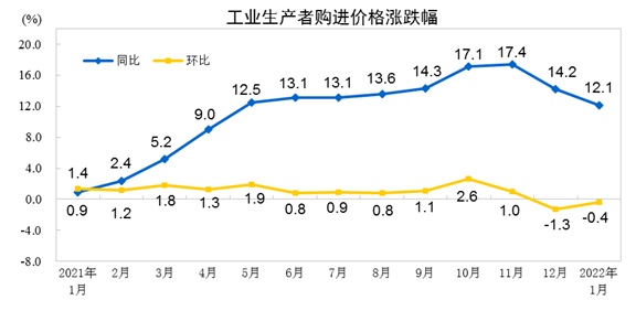 2022年1月份,全國工業(yè)生產(chǎn)者出廠價格同比上漲9.1%,環(huán)比下降0.2%;工業(yè)生產(chǎn)者購進(jìn)價格同比上漲12.1%,環(huán)比下降0.4%。